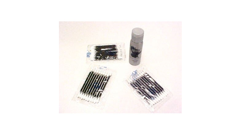 The Hawkeye Cleaning Kit contains everything you need to keep your Hawkeye borescope optics clean. Included is a bottle of lens cleaning solution and 3 packages of 10 special cotton swabs. The swabs have one rounded end for cleaning the eyepiece window and a pointed end which is perfect for cleaning the distal window and the mirror of the mirror tube.