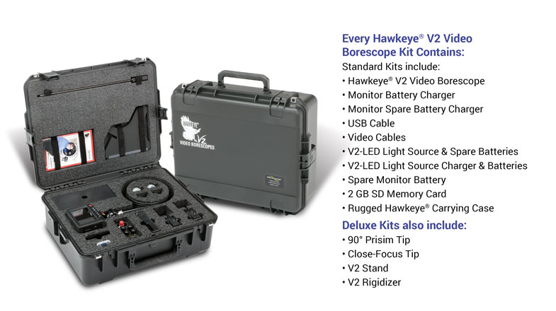 The all new Hawkeye® V2 Videoscopes contain a brighter, higher resolution, more durable camera, delivering sharp, clear photos and videos in a wide range of demanding inspection applications. The new, larger 5” LCD screen provides detailed close-up views, has a 2X zoom function, mirror image capability, and easy-to-use intuitive controls. We’ve designed a new articulation mechanism, and increased the range to +/-150 deg. The insertion tube has rugged, 4-layer construction, with a crush resistant stainless steel inner layer, and an abrasion resistant Tungsten outer layer which is urethane impregnated for smoother insertions. New optional 90º DOV Prism Tip works seamlessly with the V2. Hawkeye V2 Video Borescopes are available in diameters of 4 and 6 mm, lengths of 1.5m, 3.0m, and 6.0m. Prices start at only $8995. Made in the USA.