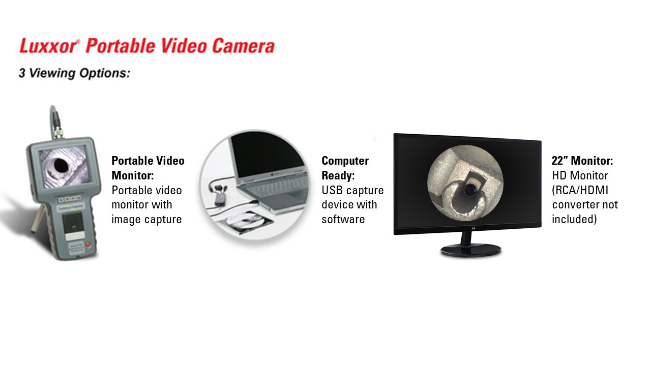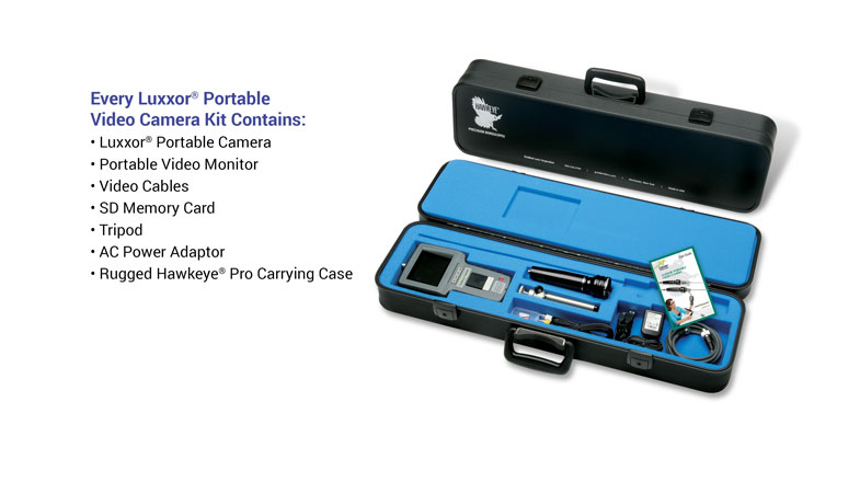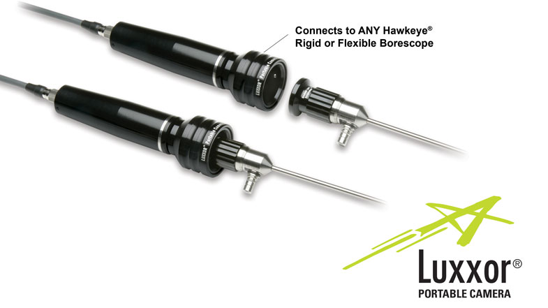 When connected to any Hawkeye Borescope, the new Luxxor Portable Video Camera delivers sharp, bright video and still images. Inspection video and still images can be viewed “live,” and captured!